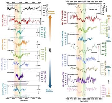 目前东亚季风区有关8.2 ka事件的水文气候记录主要集中于中国西南和中北部地区,但中国东南地区高分辨率记录较少,这限制了对东亚夏季风(EASM)降水时空演变的深入理解。本研究提供了第一条来自中国东南地区江西省神农宫洞高精度(测年误差<35年)、高分辨率(约3年)的石笋多指标记录(δ¹⁸O、δ¹³C、微量元素及生长速率),重建了中国东南地区8.2 ka事件时间序列,揭示了东亚季风区水文气候时空特征。