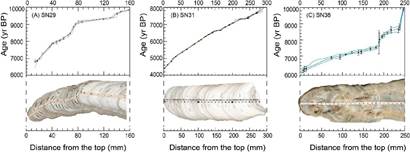 图1. 石笋SN29、SN31和SN38剖面及年代模型