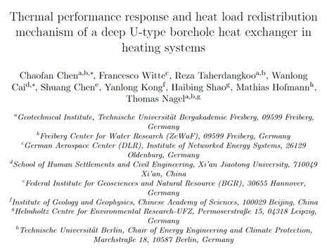 Chaofan Chen*, Francesco Witte, Reza Taherdangkoo, Wanlong Cai*, Shuang Chen, Yanlong Kong, Haibing Shao, Mathias Hofmann, Thomas Nagel. Thermal performance response and heat load redistribution mechanism of a deep U-type borehole heat exchanger in heating systems [J]. Applied Energy (2025): xx: x-xx. (出版中)