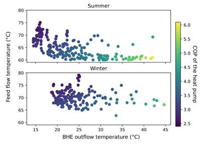 论文首次开发了中深层地埋管耦合热泵动态性能仿真模型,阐明了系统内部负荷分配机制并开展了热泵设计参数优化。此外还探讨了将该系统与城镇供热系统联动运行的可行性与灵活性。