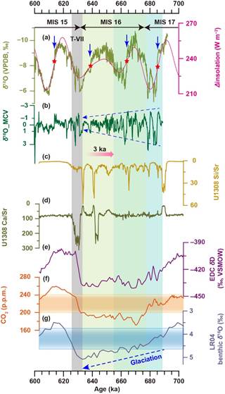 图2. 过去69到60万年的洞穴石笋氧同位素(δ18O)记录和其他记录的对比。(a)该研究提供的石笋δ18O记录(绿色)和太阳辐射变化(粉色)。(b)石笋记录中指示的千年尺度亚洲夏季风变率。(c)和(d)北大西洋冰筏碎屑变化。(e)南极冰芯氢同位素(δD)记录。(f)大气CO2记录。(g)海洋底栖有孔虫记录。灰色条带表示冰期终止期Ⅶ,其他条带表示调节千年变率振幅变化的三种CO2和冰量条件。橙色和蓝色水平条带分别表示中等冰期条件下的CO2和冰量状态。