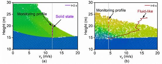 图4 滑坡运动过程中从(a)固态运动特征到(b)类流态运动特征转变