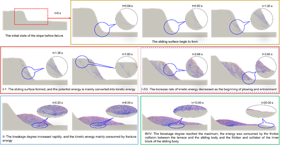 文章简介:本研究基于构建的有限–离散元耦合方法(FDEM)数值模型,定量揭示黄土高速远程滑坡运动全过程特征。研究定量表征了运动过程中滑体物质由连续结构向非连续结构转变、运动状态由固态向类流态转化的动态过程,阐明了物质运移与能量转化的耦合作用机制。滑坡运动由加速向减速转变的动力学过程受控于势能–动能转化及摩擦能耗与破裂能耗的此消彼长:势能向动能的持续转化驱动滑体加速运移,而减速过程前期以破裂能耗占主导,后期则以摩擦能耗为主。