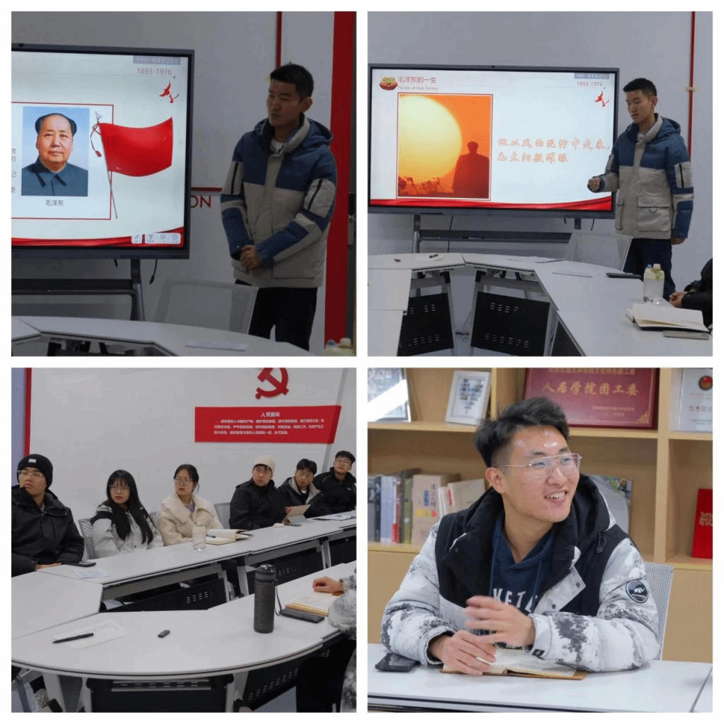 首先,支部成员陈久明作主题宣讲,带领大家学习回顾了伟大领袖毛泽东波澜壮阔的一生。他以毛泽东的人生历程为主线,从“少年时期”、“青年时期”、“抗日战争与解放战争”及“建国后期”四个篇章切入,通过讲述毛泽东的求学经历、信仰确立、战略思想、建国举措,回顾了毛泽东的不朽功勋,阐释了毛泽东思想的科学体系、地位和新时代内涵,并号召同学们牢记领袖的嘱托,以伟人为标榜,争做有理想、敢担当、能吃苦、肯奋斗的新时代好青年。