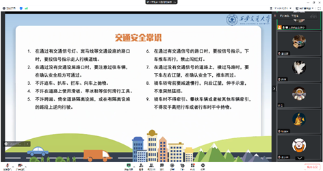 活动主要讲述交通安全、火灾预防、电信诈骗的识别与预防三个常见的假期安全事故,提醒同学们重视交通安全,切实做好防火工作,着重说明安全出行、提防诈骗、远离网贷的重要性。
