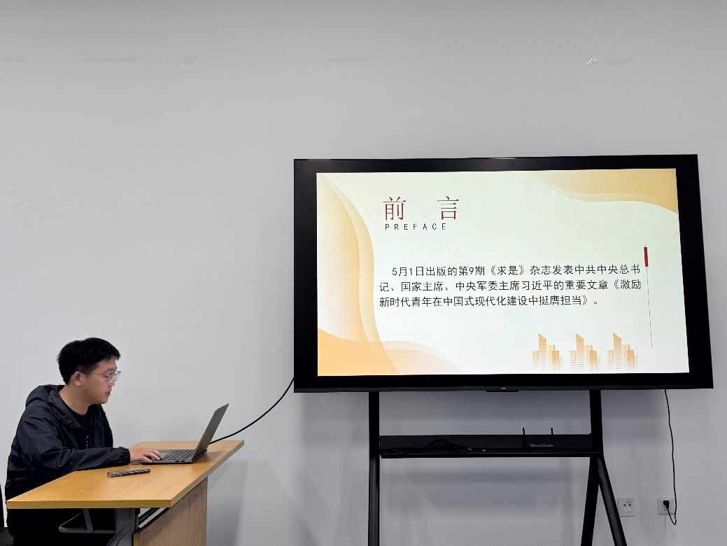 随后,团支部书记吉强围绕《求是》杂志文章《鼓励新时代青年在中国式现代化建设挺膺担当》展开领学。通过"理论要点+典型案例"的方式,他重点解读新时代青年应具备的政治素养和实践要求。在理论层面,深刻剖析“四个坚持”的思想内涵,而在实践层面则以优秀校友参与灾后重建、学生团队服务基层社区的生动案例,说明如何将八项规定倡导的务实作风转化为青春建功的实际行动,进一步明确将纪律意识融入专业学习、科研创新和社会服务的具体路径。