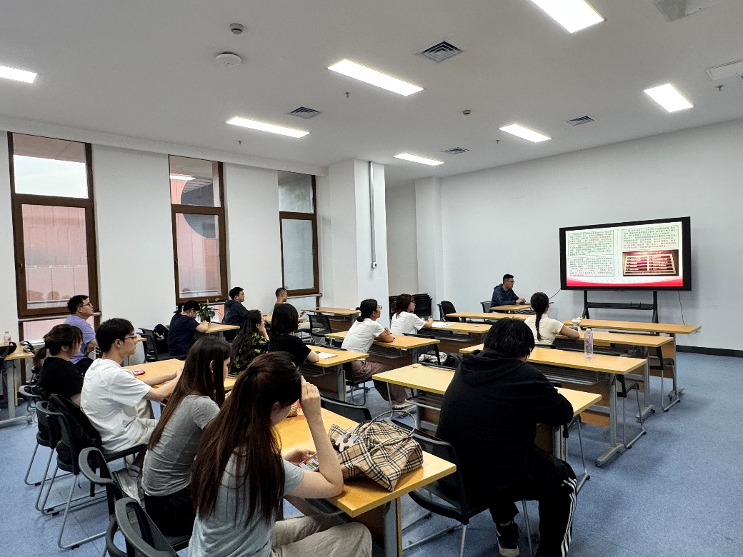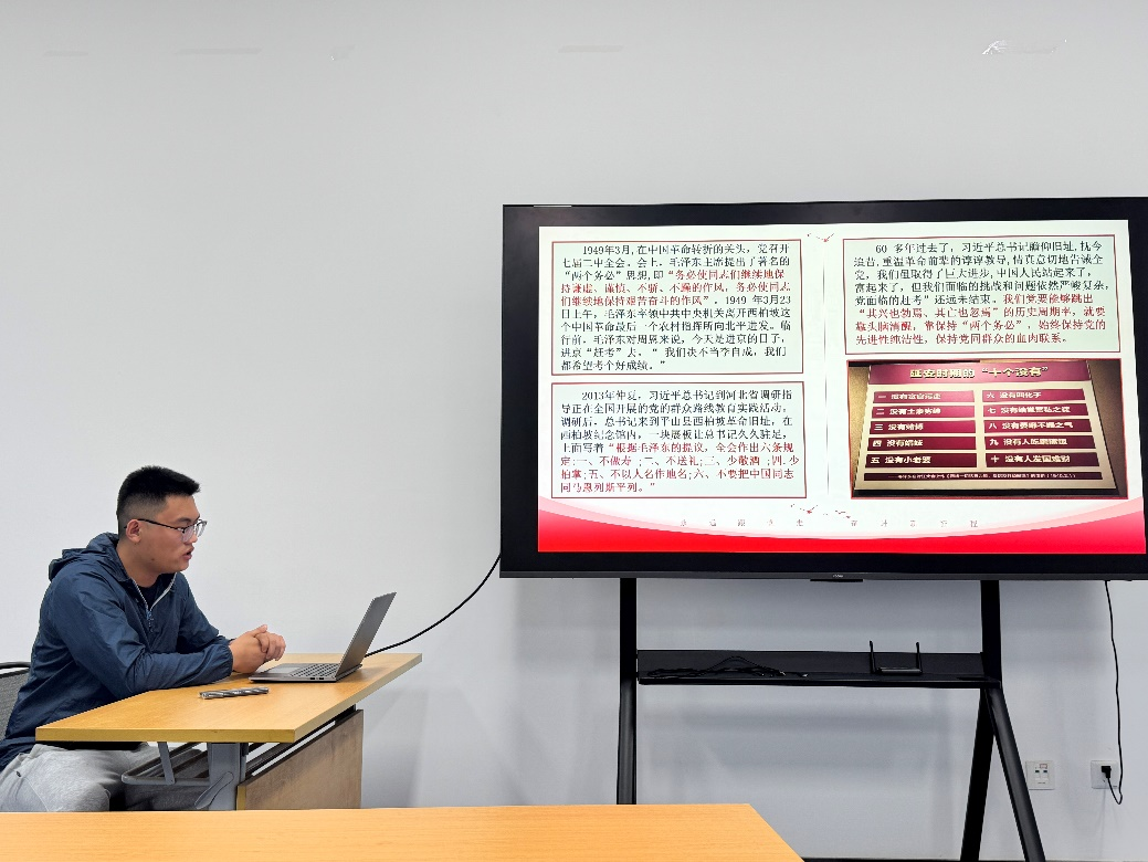 活动第一项,党支部副书记王森作中央八项精神专题学习报告。他以历史逻辑为脉络,系统梳理了从延安时期的“两个务必”,到新时代中央八项规定精神之间的传承与发展。他指出,八项规定是党密切联系群众、改进工作作风的行动纲领,体现了党在不同历史阶段对自身建设的高度自觉。结合校园实际,王森重点剖析了学生党员在科研、班级管理、社会实践中的可能出现的作风问题。他呼吁全体成员在学习与生活中践行“知行合一”的理念,将作风建设融入点滴细节,共同营造风清气正的校园生态。