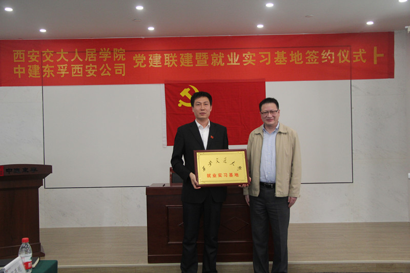 随后,杨鹏书记和刘静书记代表双方签订了党建联建和学生就业实习基地两个协议。学校就业指导中心李勇副主任为中建东孚西安分公司颁发实习基地标识牌。