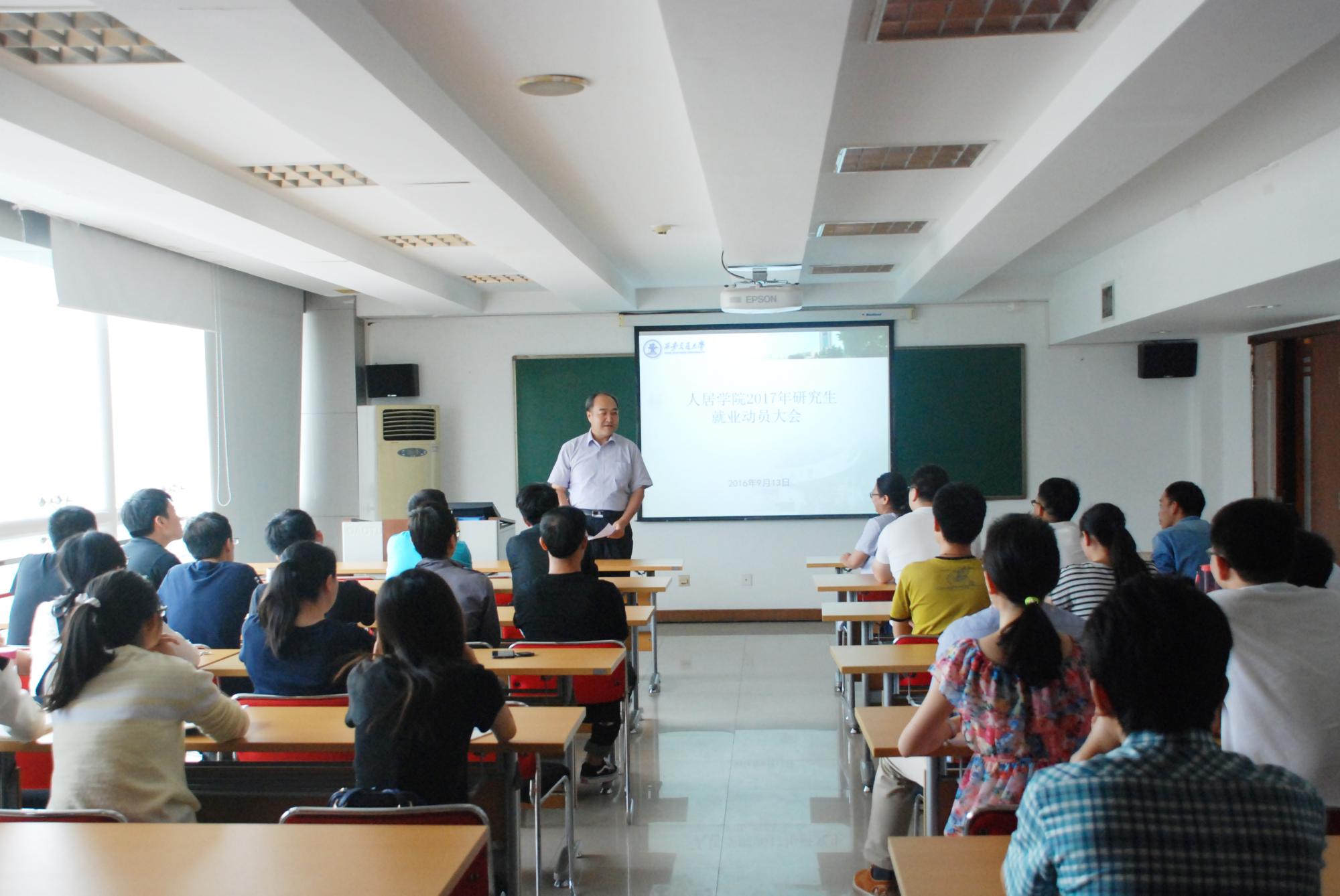 9月13日下午,人居学院 2017届研究生就业动员大会在曲江校区西一楼人居学院第一议室举行。人居学院副院长马建勋、学院研究生辅导员汪毅香及2017届全体毕业生参加此次会议,会议由研究生辅导员汪毅香主持。