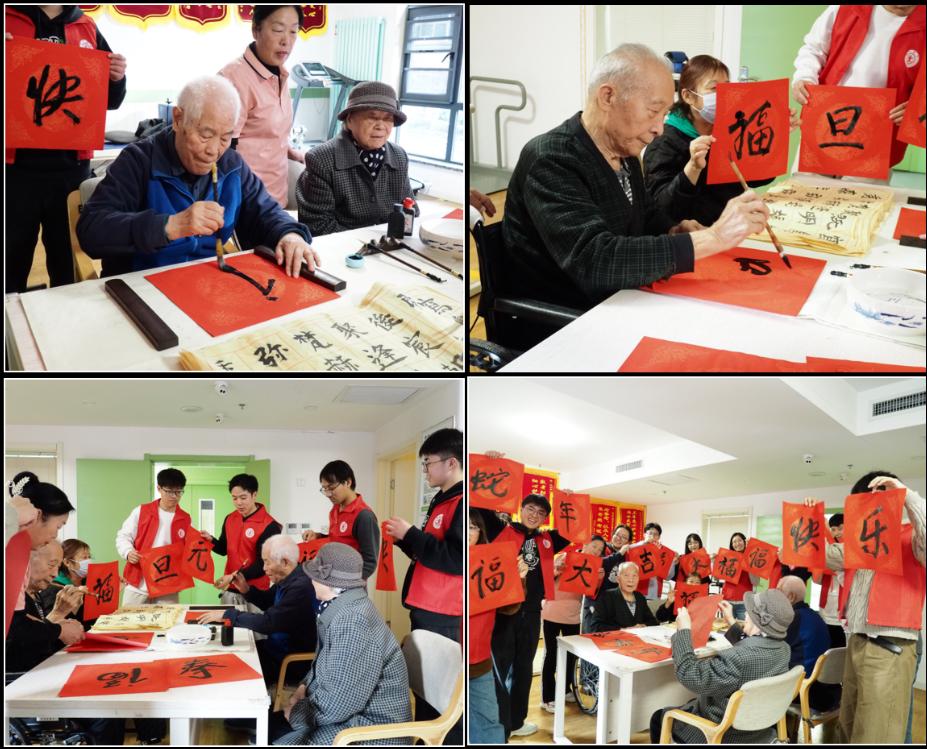 “过新年、贴福字”是中华民族延续至今的传统文化习俗。志愿者们邀请老人们一起写福字、贴福字。大家兴致勃勃,挥毫泼墨,在一张张红纸上书写出满载吉祥与好运的福字。书写完成后,志愿者们将一幅幅墨香缭绕的福字送到行动不便的老人们手中,并送上真挚的问候和祝福,大家手捧红福,脸上洋溢着喜悦之情。一横一竖、一撇一捺,写的是汉字、暖的是人心,浸润的是优秀文化,续写的是美好祝愿。