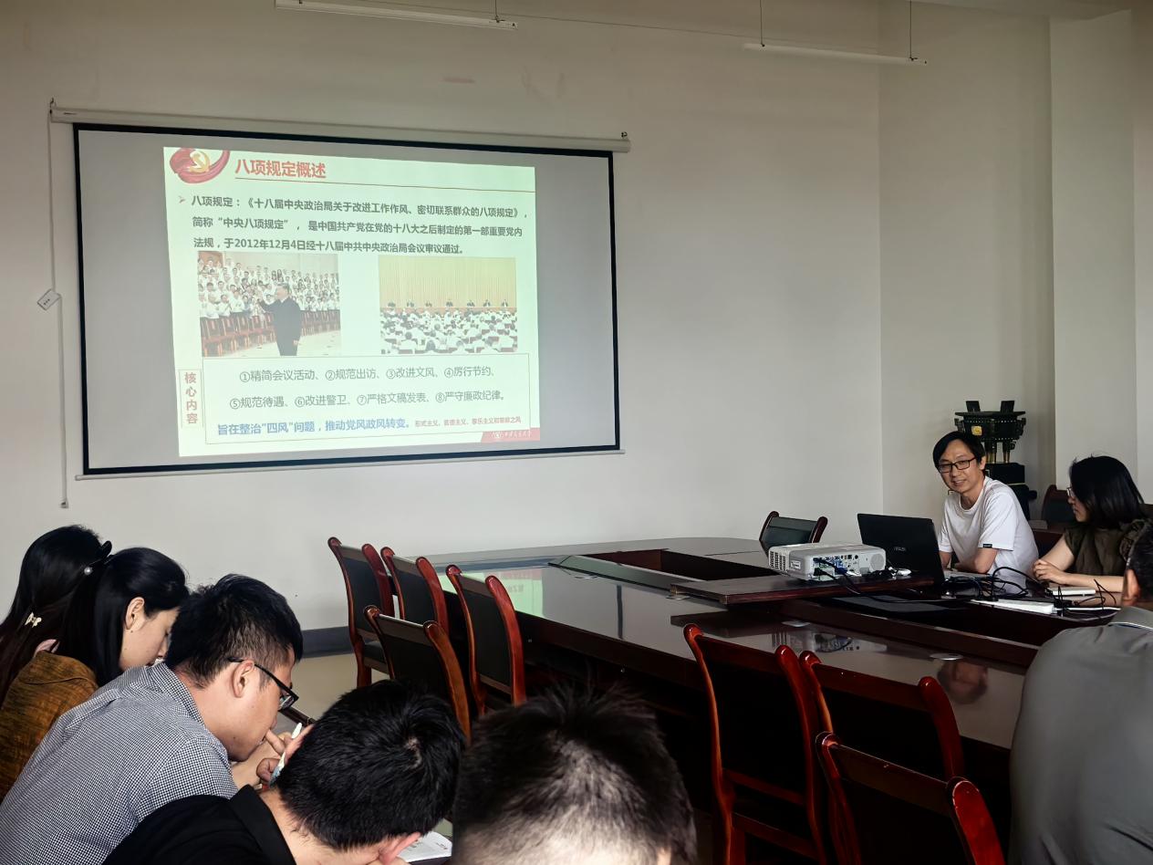 4月23日支部主题党日活动上,党支部书记徐晗同志进行了《十八届中央政治局关于改进工作作风、密切联系群众的八项规定》(简称“中央八项规定”)的领学,针对八项规定精神的内涵以及违反中央八项规定精神具体表现进行了详细介绍。接着,博士生党小组组长党昊昱同学播放了《高校纪检监察机构纵深推进正风肃纪反腐纪实》等系列师德警示教育视频学习材料。集中学习后,党支部同志们进行了讨论,纷纷表示将在未来工作生活及科研教学过程中遵守相关规定,以八项规定及符合中央八项规定内涵的一系列政策规定为准绳严格要求自己。