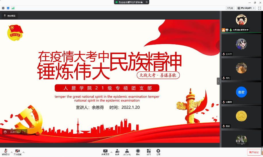 2022年1月20日,人居学院2021级专硕班于线上召开一月团组织生活会暨返乡班会。首先,会议由团支部书记余恩得同志主持召开团支部一月组织生活会。分别学习总书记二〇二二年新年贺词、北京冬奥会的历史意义和文化价值和全校师生疫情防控倡议书。第一部分全体成员认真观看习总书记二〇二二年新年贺词,在中国发展的历史银河中,中国声音、中国瞬间、中国故事不断告诉我们:再大的困难,除以14亿,也必将被克服;再微小的力量,乘以...