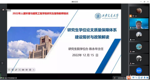 以提高研究生培养质量为目标,以研究生和导师为核心,以强化过程管理为重心,人居学院联合研究生院于12月15日,运用线上形式召开了学院全体研究生导师培训会。常务副院长许领主持会议,研究生院学位办陈永华主任作关于“研究生学位论文质量保障体系建设现状与政策解读”的专题报告。 学院党委书记杨鹏针对学院对研究生培养质量要求作了简要介绍,学院从过程的管理、文件的出台、导师的指导层层把关,尤其是因疫情给整个培养工...
