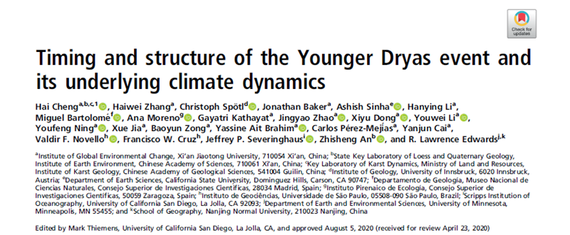 2020年9月8日,美国科学院院刊《Proceedings of the National Academy of Sciences》杂志刊登了西安交通大学全球环境变化研究院程海教授团队的论文——“新仙女木事件的年代与结构及其指示的气候机制”(Timing and Structure of the Younger Dryas Event and Its Underlying Climate Dynamics)。图1. PNAS文章截图新仙女木(Younger Dryas,简称“YD”)事件是发生在距今12900-11600年前的一次气候快速变冷事件,对全球...