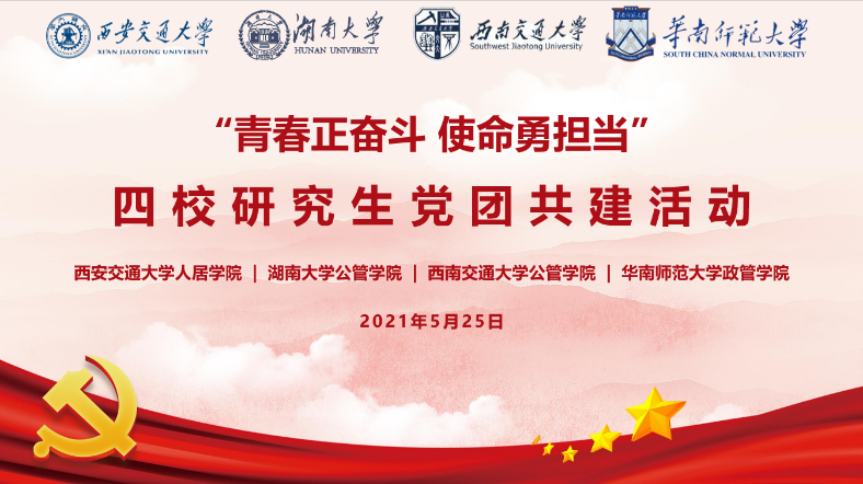 述往思来,向史而新。回顾光辉坎坷的百年历程,中国共产党从1921年成立至今,经历了百年风雨,一路栉风沐雨、筚路蓝缕,从一个仅有50多人的党发展成为拥有9000多万名党员的世界最大政党。为了重温党领导人民革命、改革、建设社会主义的历史进程,深入学习中国青年们为国家富强、民族振兴、人民幸福不懈拼搏奋斗的精神。2021年5月25日,西安交大人居学院2020级专硕党支部联合湖南大学公共管理学院2020级研究生党支部、西南交通大...