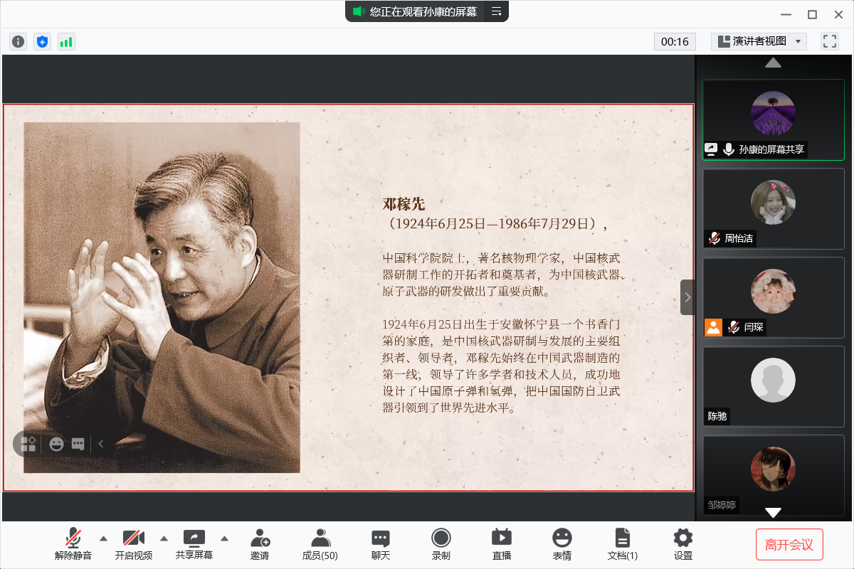 为深入贯彻落实团支部三会两制一课制度,加强支部成员对党史的学习,人居学院2020专硕党团支部策划并开展线上党史系列学习活动——《党史人物志》。本次系列学习活动由支部入党积极分子领学,党员、共青团员和群众广泛参与,预计五周时间共学习十位党史人物的先进事迹。支部于2021年5月11日晚与5月14日晚进行了前两期的学习。会议由人居学院2020级专硕团支部书记陈驰同志主持。支部成员们认真学习了关于邓稼先和李达两位在党的...