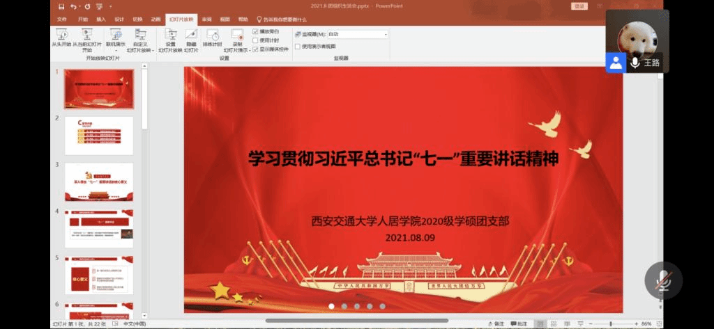 为深入学习贯彻习近平总书记“七一”重要讲话精神的重大意义、主要内容和丰富内涵,2021年8月9日晚,人居学院2020级学硕团支部通过腾讯会议召开8月份组织生活会,再度研习落实习近平总书记“七一”重要讲话的指示精神,会议由支部宣传委员王路主持,支部成员参加了此次会议。会议中,王路带领大家分别学习了“七一”重要讲话的核心要义、重大意义、丰富内涵以及实践要求。习近平总书记的重要讲话,全面回顾一百年来我们党围绕实...