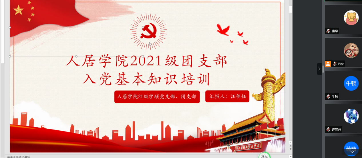 中国共产党始终代表着先进文化的前进方向,许多刚入学不久的新生对成为一名党员充满憧憬。2021年10月20日,2021级学硕班党、团支部通过腾讯会议线上召开了入党知识宣讲会,为研一的团员们详细介绍了入党的流程及相关的基础知识。中国共产党人的初心和使命,就是为中国人民谋幸福,为中华民族谋复兴。党支部副书记汪佳钰同志强调每一位团员同志在向党组织靠拢的任何时期都要时刻牢记中国共产党人的初心和使命。最后向各位同学...